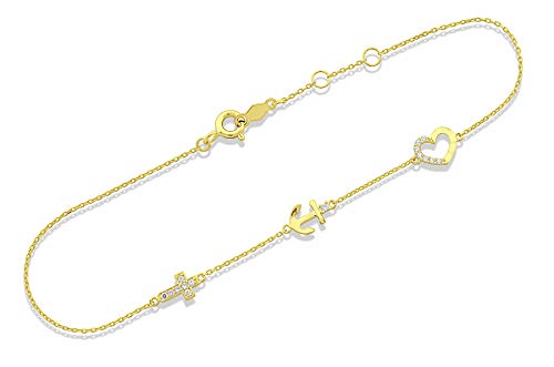 Sold 14K Yellow Gold CZ Small Cross Heart & Anchor Charm Bracelet - 8in