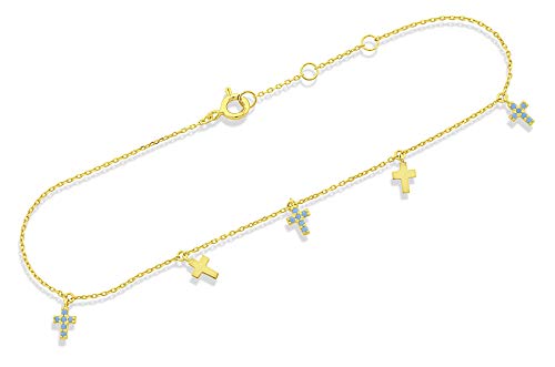 Sold 14K Yellow Gold CZ Small Simulated Turquoise Cross Charm Bracelet - 8in